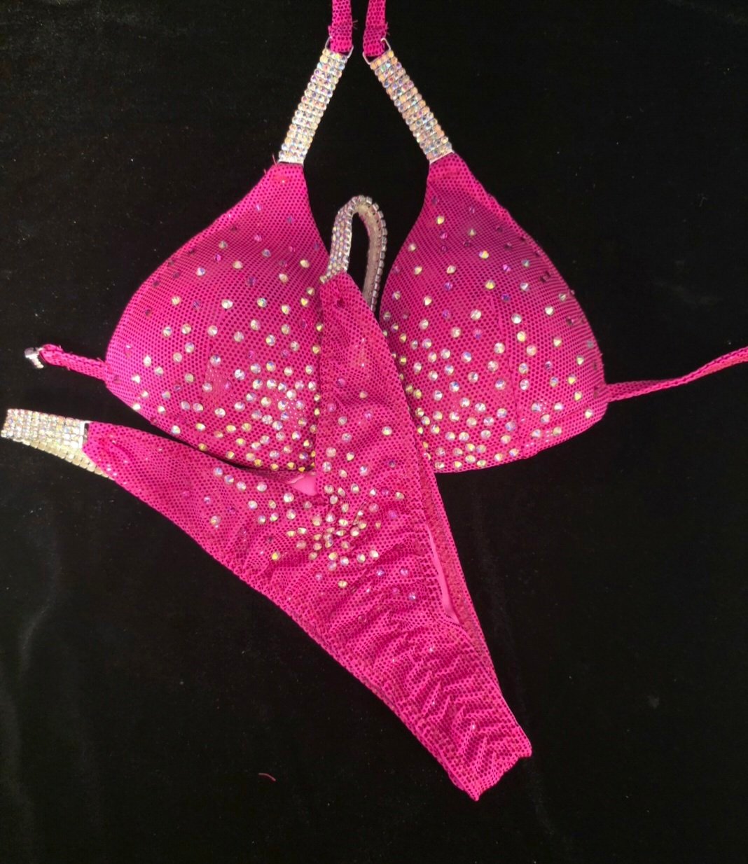 Stand out on stage without breaking the bank. This Level 1 hot pink bikini features a sparkling scatter of crystals and classic connectors—perfect for competitors seeking glam on a budget. This suit is available in all colours..just choose your base colour and crystals to create your own unique bikini. Drop a message to discuss options. This is also available in figure