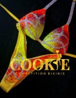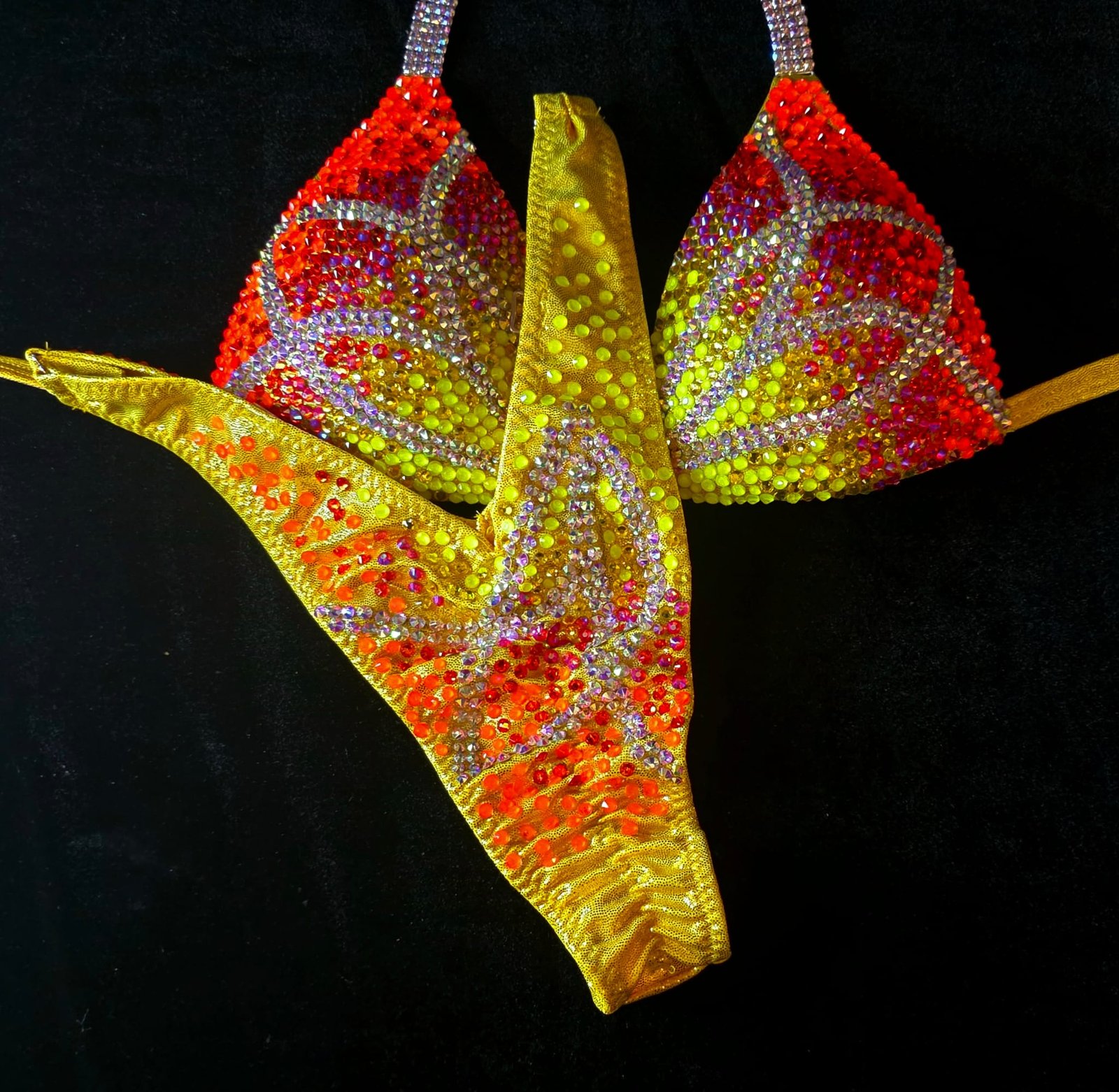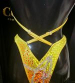 A radiant Fleur crystal design inspired by tropical flowers and sunshine. This Level 4 suit blends vivid citrus yellow with fiery orange tones, framed by flowing crystal detailing that creates a floral burst of sparkle across the cups and bottom.