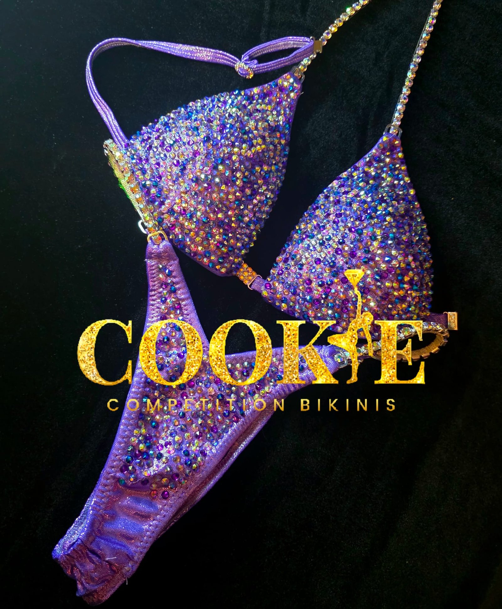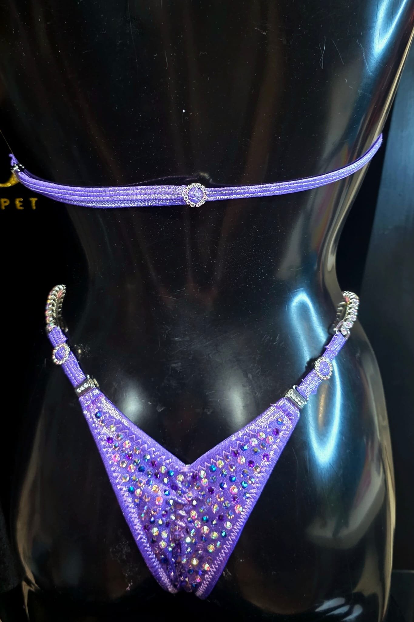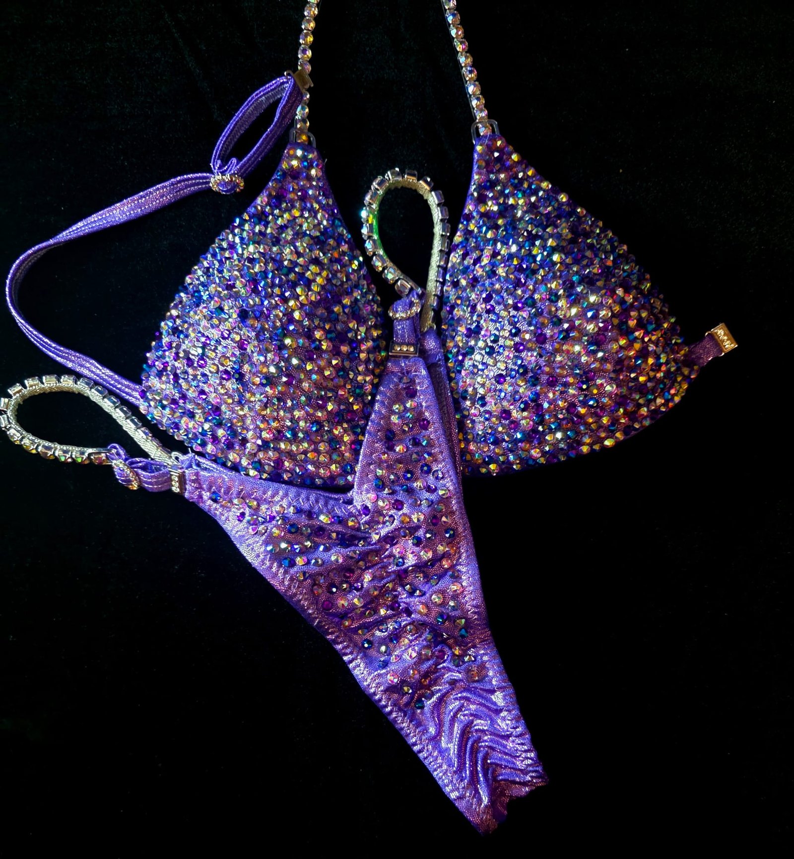 A full-coverage mixed scatter crystal design that delivers maximum sparkle from every angle. This Level 4 suit features densely layered AB crystals over a rich lilac/lavender base, creating a multidimensional shimmer that lights up the stage. Designed for competitors who want bold brilliance with a clean, elegant silhouette, this piece balances heavy crystal impact with refined shaping for a polished pro finish.